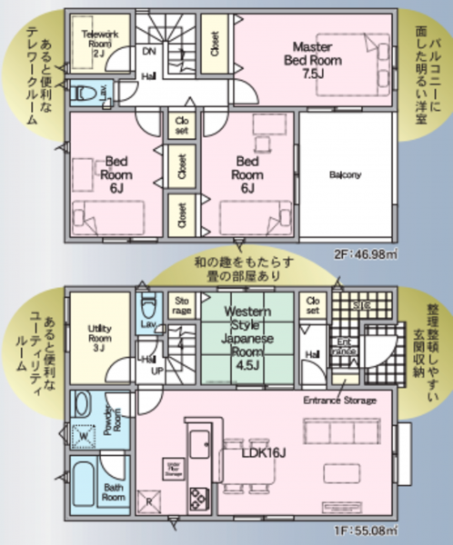 - システムキッチン、カウンターキッチン、シャンプードレッサー、洗浄便座、複層ガラス、ウォークインクローゼット、モニタ付インターホン、駐車場3台分、床下収納、トイレ2箇所