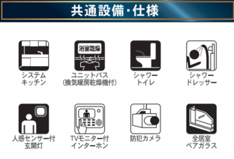 システムキッチン、シャンプードレッサー、洗浄便座、浴室乾燥機、複層ガラス、モニタ付インターホン、防犯カメラ 人感センサー付玄関灯
