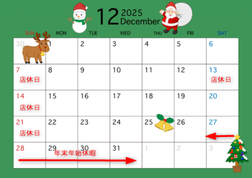 休業期間内につきましては、何かご不明な点がございましたら弊社のホームページ内お問い合わせフォームよりご送信いただけますようお願い申し上げます。お問い合わせに対するご返信は年明けの1月7日より順次させていただきます。